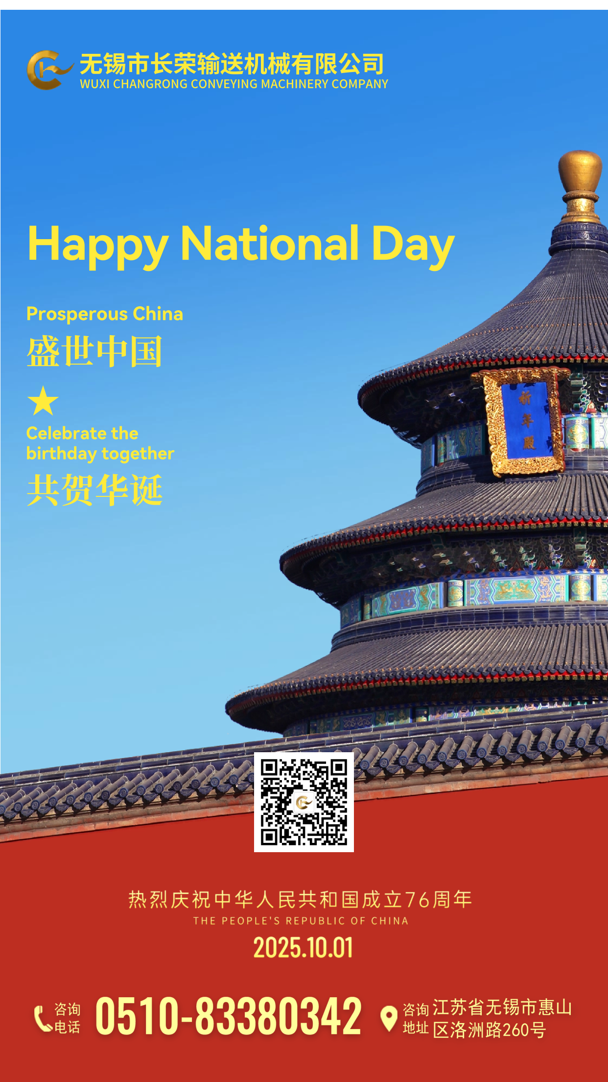 | In praise of the birthday of our motherland! Wuxi Changrong Conveying Machinery wishes our motherland prosperity and strength! |